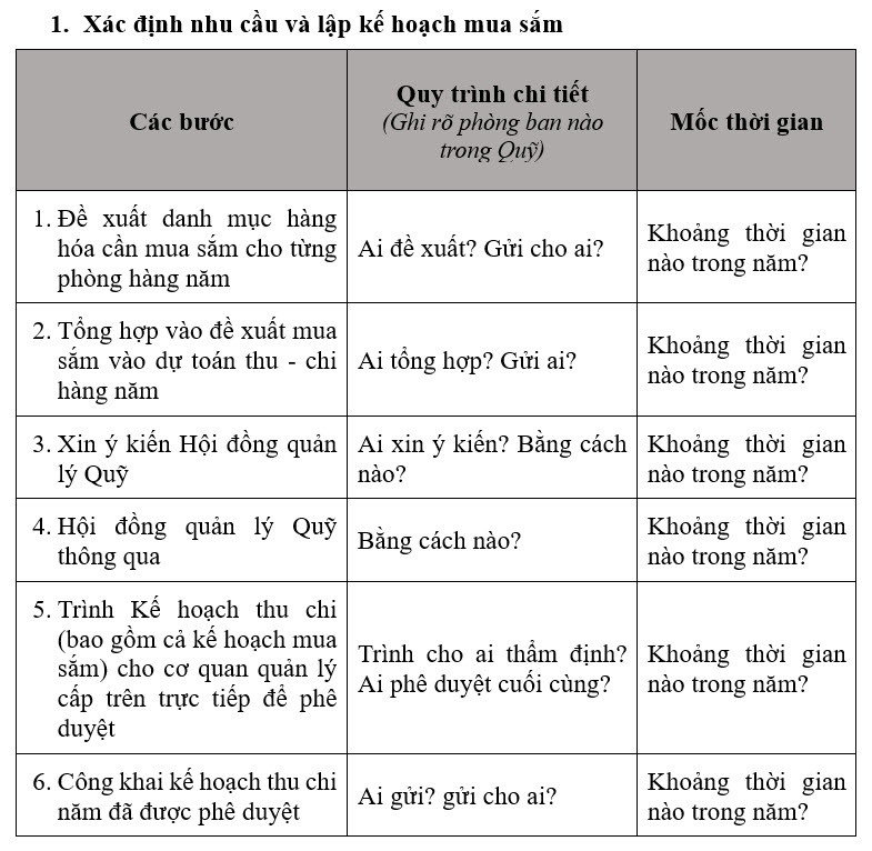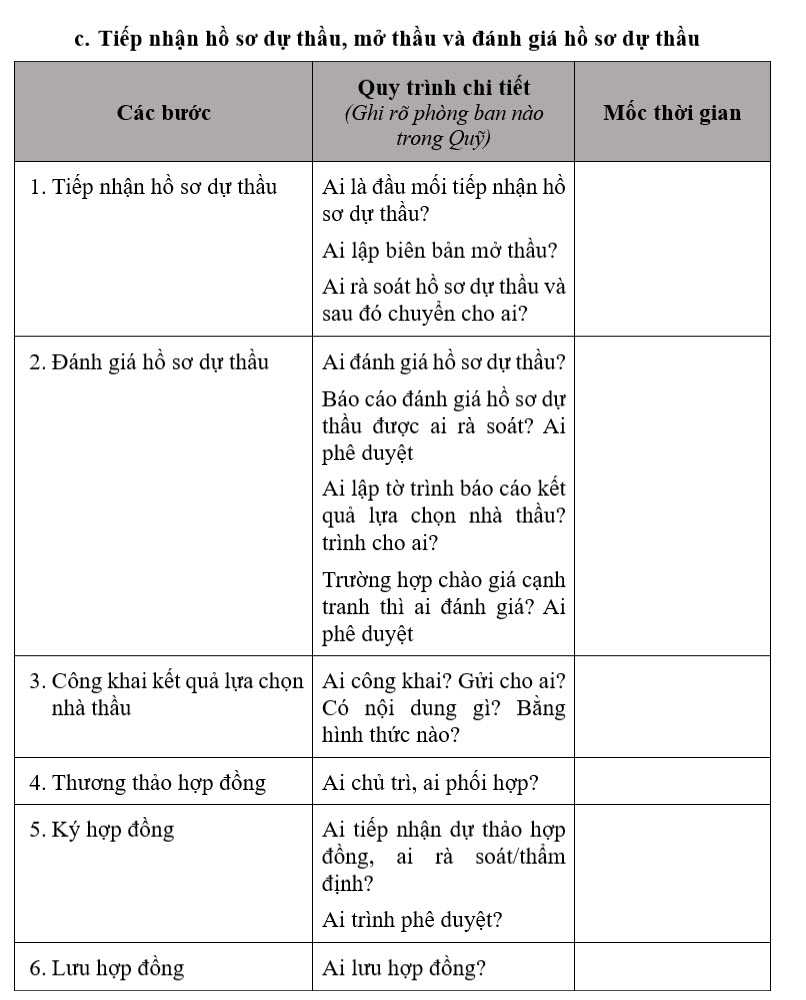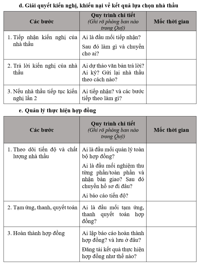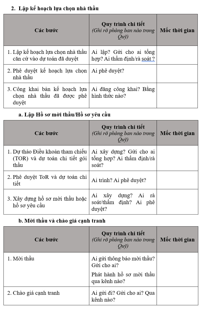 Thông tin cần thu thập sẽ tập trung vào quy trình nội bộ của từng Quỹ cấp tỉnh trong quá trình thực hiện các hoạt động mua sắm, đấu thầu. Các anh/chị có thể rà soát, thêm bớt các bước cho phù hợp với thực tế đơn vị đang thực hiện và điền trực tiếp thông tin vào cột bên trong từng bảng nhỏ.